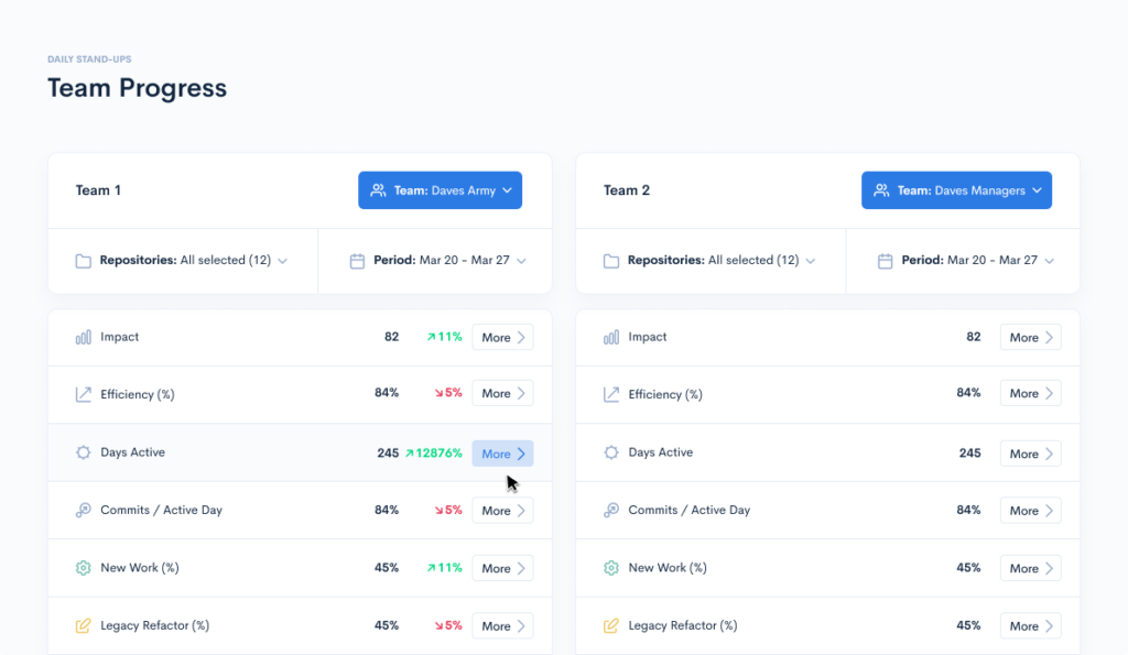Scaling your team is not the miracle option that will increase performance and help you deliver your projects quickly. On the contrary, As Fred Brooks states “adding manpower to a late software project makes it later.” – meaning that hiring more engineers is no guarantee for faster delivery. By analyzing Impact, teams are able to understand and communicate how staffing changes have affected their progress