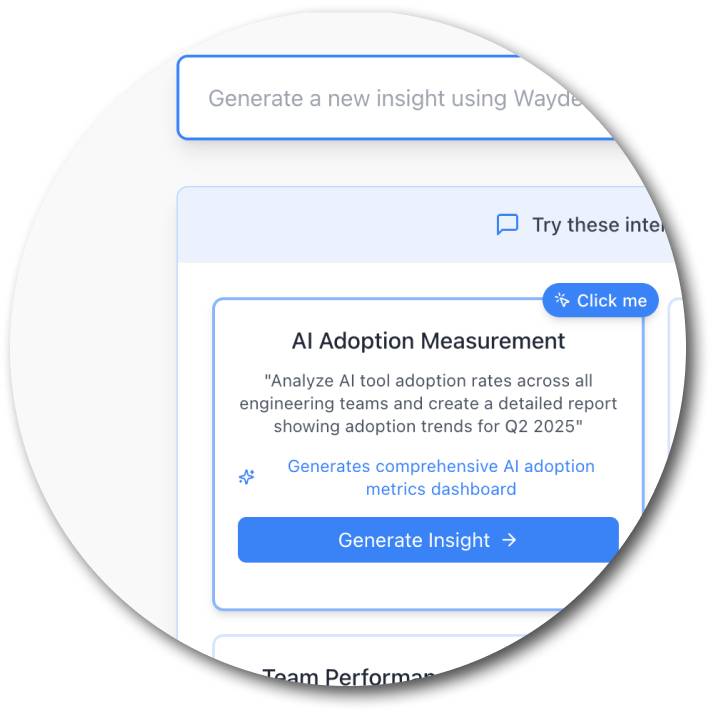 Waydev AI cuts through the noise of dashboards and vanity metrics. Simply ask: “What’s our average cycle time this sprint?”, “Who are our top 10 AI adopters?”, “Which teams are accelerating velocity?” and get instant, data-backed answers. Connect your tools, ask your questions, and let Waydev AI surface the insights that static reports hide.