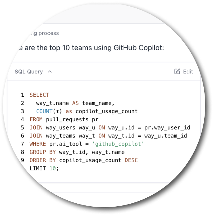 Go beyond static, prebuilt metrics. With editable SQL queries, you can tailor insights to your engineering organization’s unique structure and track what matters most.