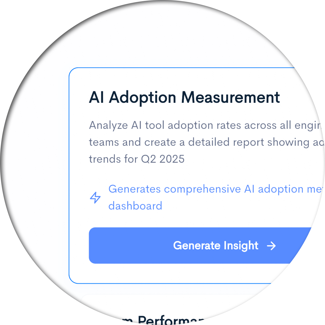 Start a Free TrialAsk questions in natural language and get instant insights into team performance, delivery speed, or AI’s impact on developer productivity across organization.