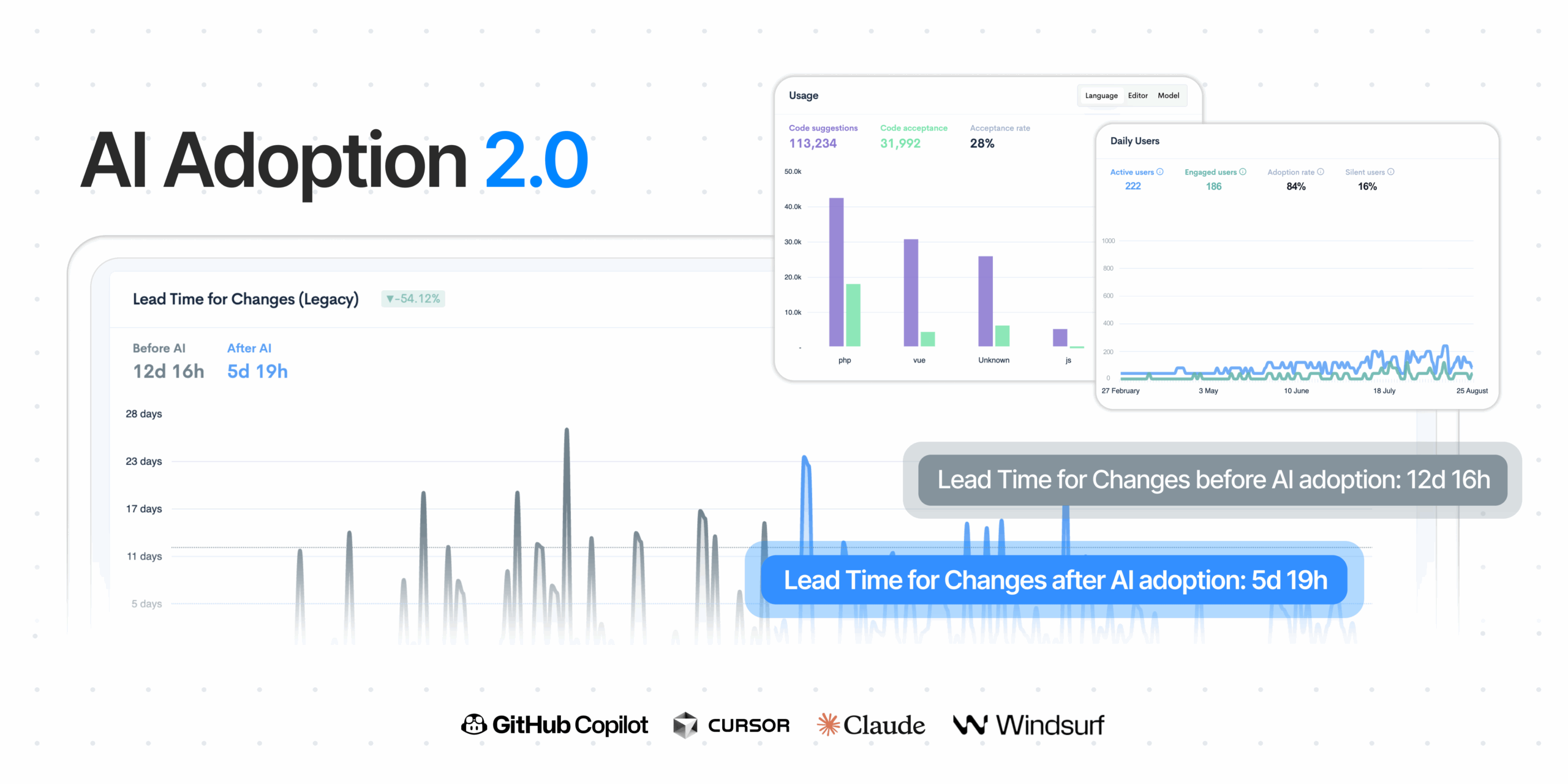 AI Adoption 2.0 brings that clarity. Waydev now supports GitHub Copilot, Cursor, Claude Code, and Windsurf on the same page, giving you a complete view of how your teams adopt and benefit from AI across every tool they use.