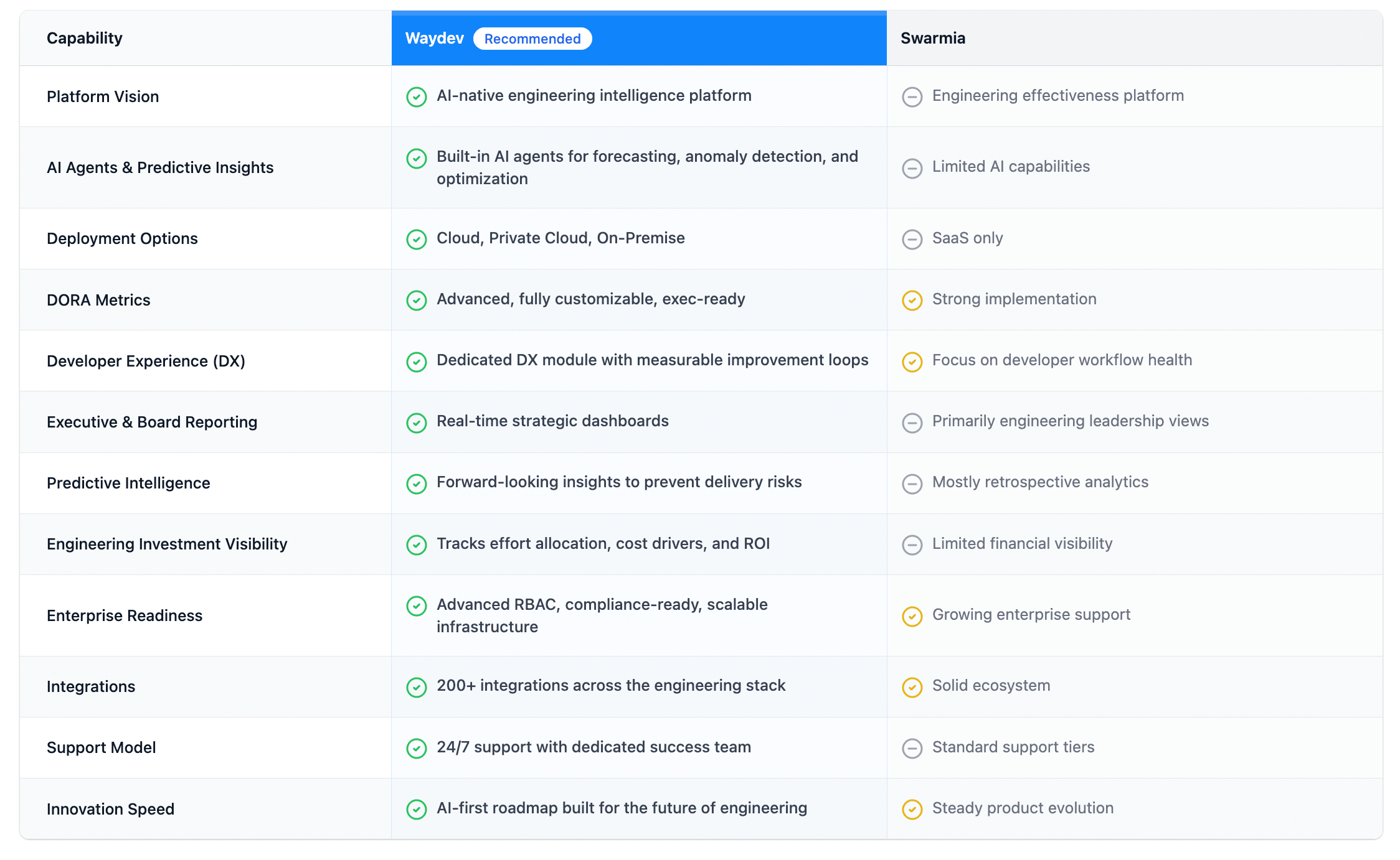 Here’s how Waydev is a superior software engineering intelligence platform compared to Swarmia: